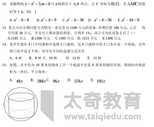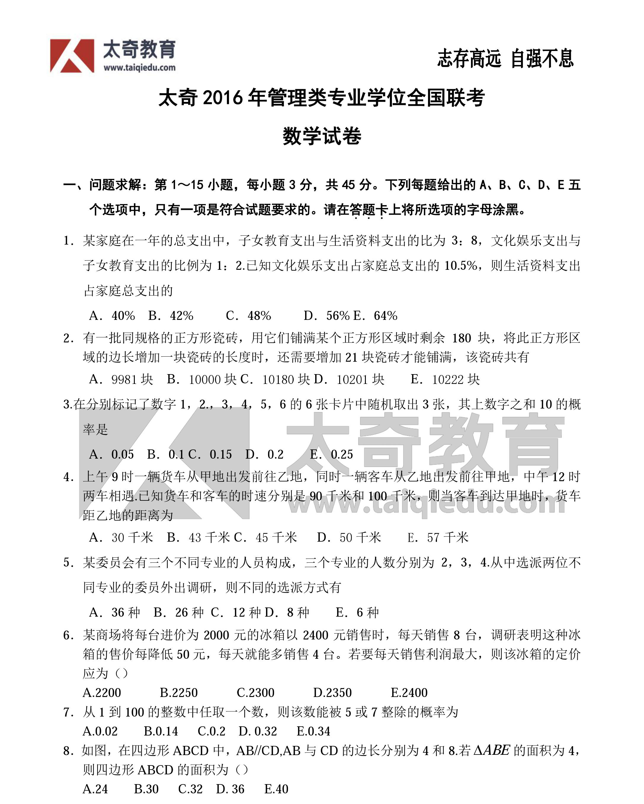 2016MBA管理類聯(lián)考數學真題:問題求解
