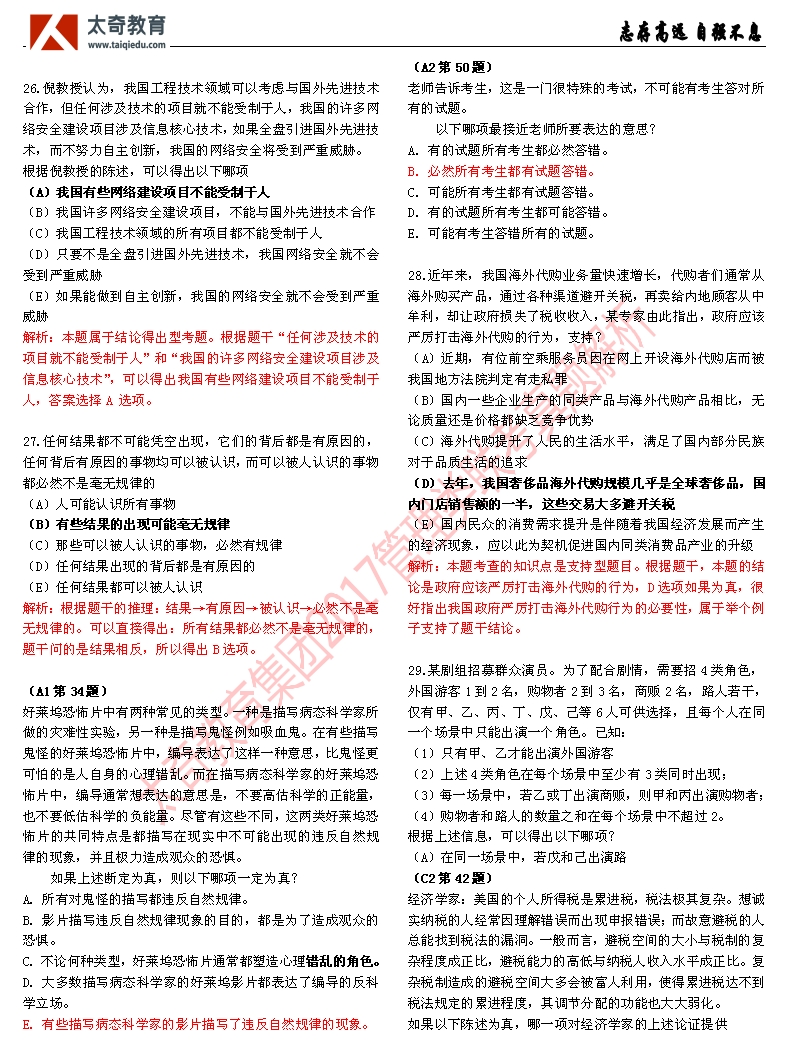 祝賀太奇教育2017管理類聯(lián)考邏輯直接命中46分