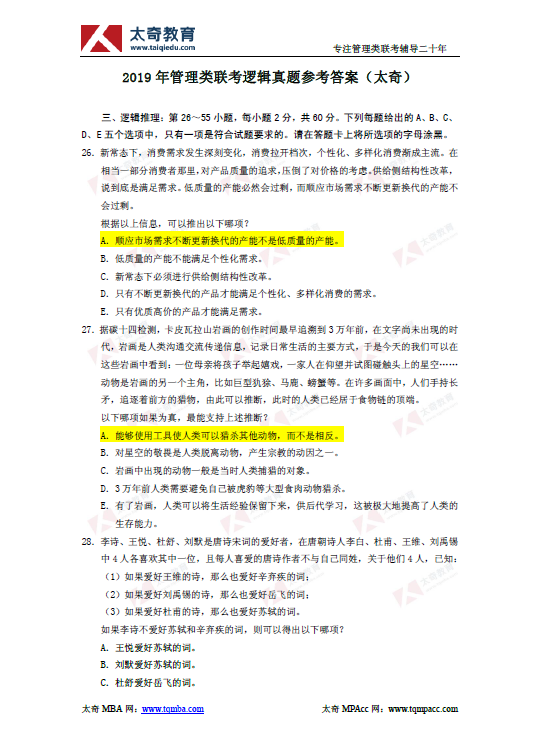 更多2019年管理類聯(lián)考真題答案及解析、考后復試調劑資訊,請點擊在線咨詢太奇教育!