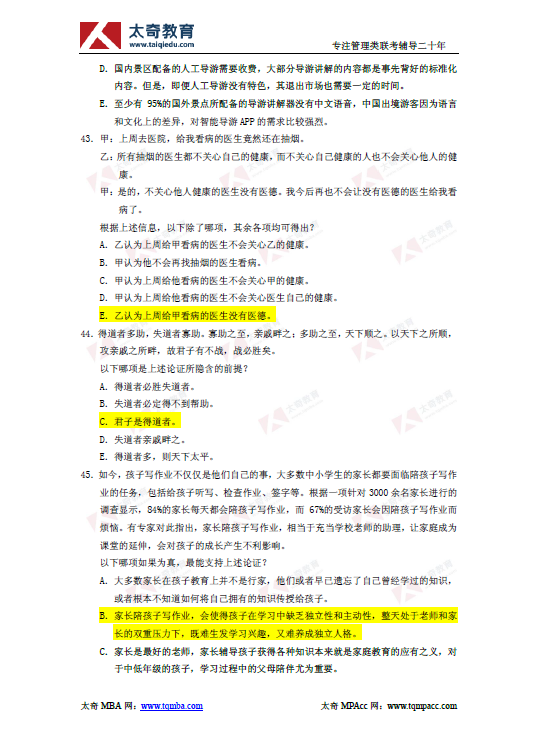 2019年管理類聯(lián)考綜合能力邏輯真題及參考答案(7)