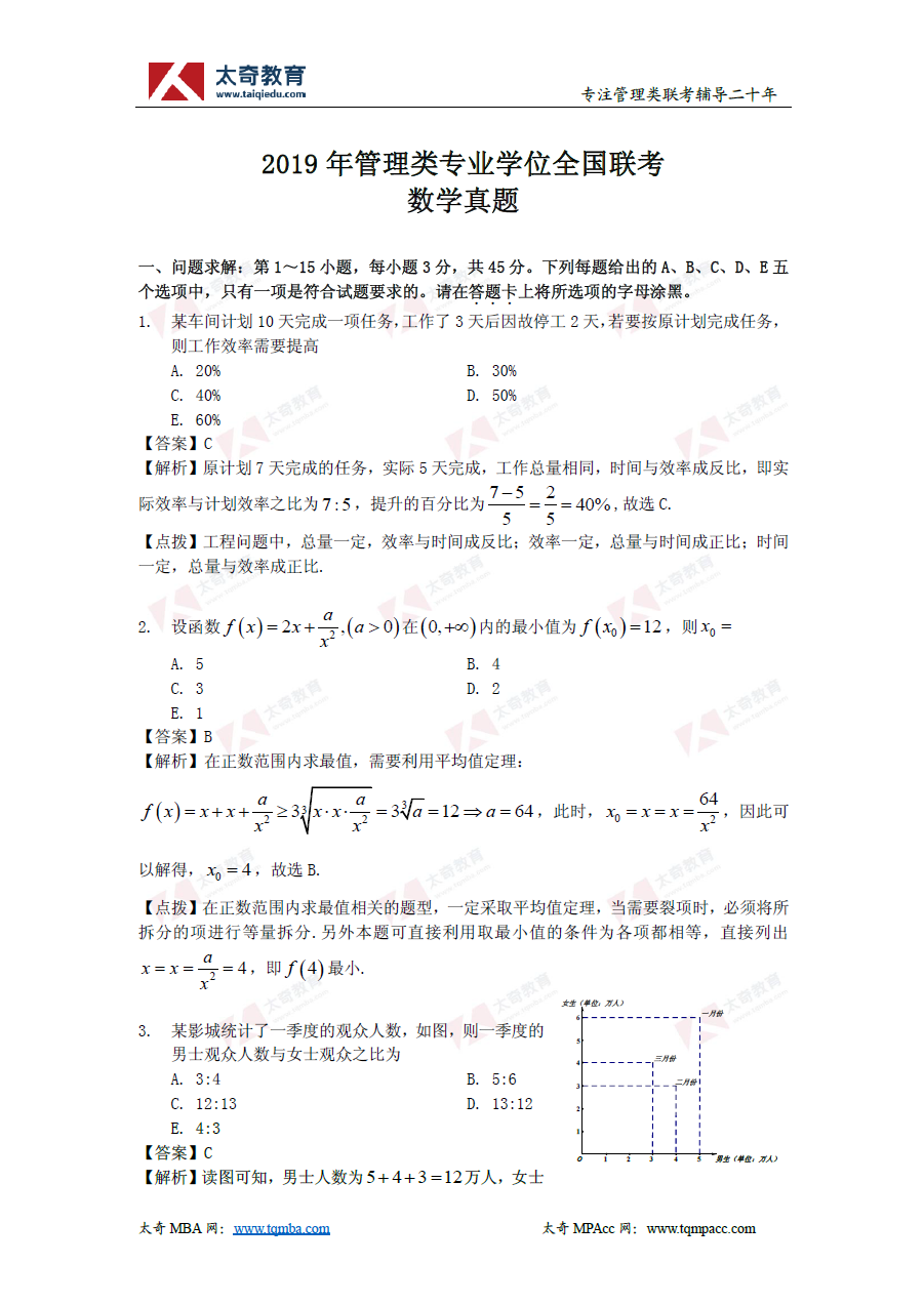 2019年管理類聯(lián)考數(shù)學(xué)真題+解析(太奇官方版)