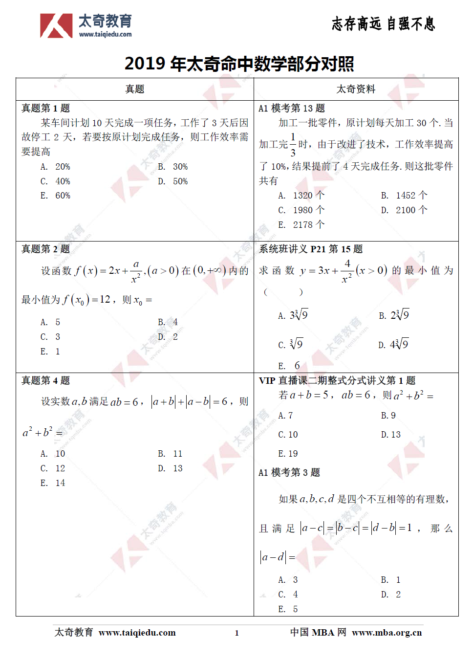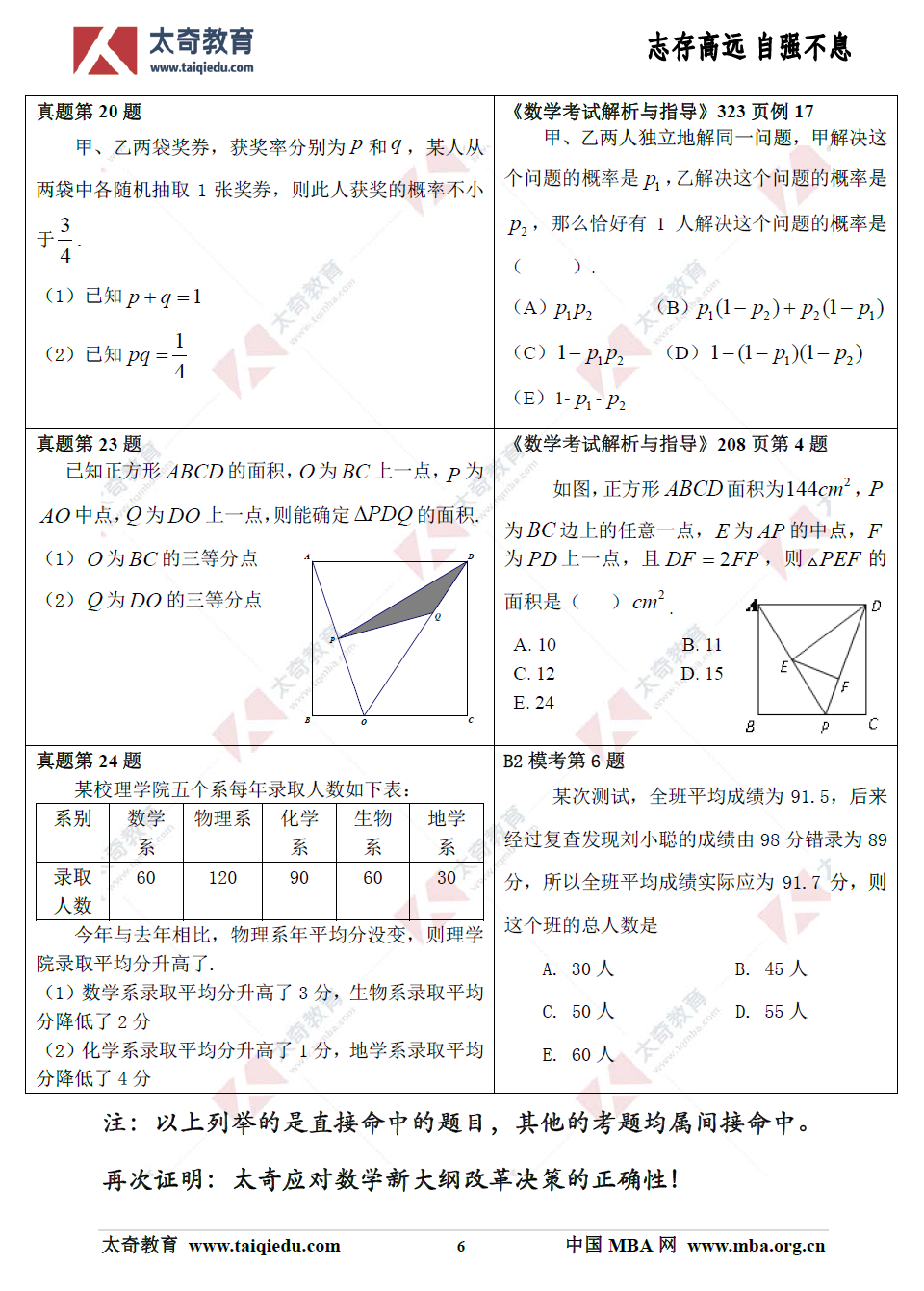 在2019年管理類聯(lián)考中,綜合數(shù)學(xué)考試部分直接命中57分,其他考題均屬間接命中,附《太奇2019年管理類聯(lián)考數(shù)學(xué)真題命中對(duì)照》!再次證明:太奇應(yīng)對(duì)數(shù)學(xué)新大綱改革決策的正確性!比命中考題更為重要的是:太奇在對(duì)每次??嫉闹R(shí)點(diǎn)、考點(diǎn),尤其在對(duì)命題方向的把握上極其精準(zhǔn)。