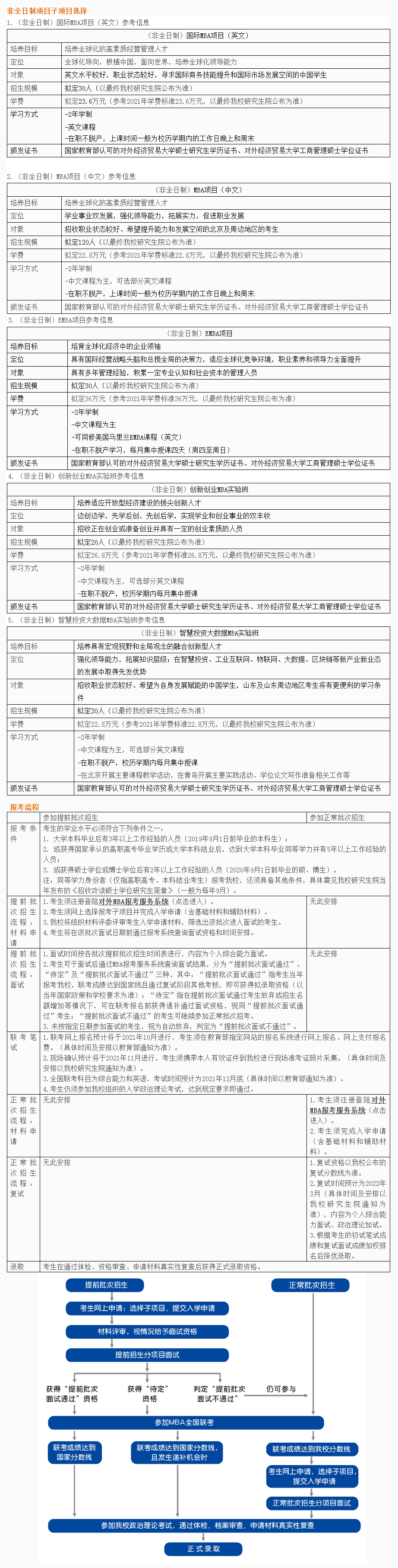 1.招生類別分為五個(gè)子項(xiàng)目,分別為:①(非全日制)國際MBA項(xiàng)目(英文)、②(非全日制)MBA項(xiàng)目(中文)、③(非全日制)EMBA項(xiàng)目、④(非全日制)創(chuàng)新創(chuàng)業(yè)MBA實(shí)驗(yàn)班、⑤(非全日制)智慧投資大數(shù)據(jù)MBA實(shí)驗(yàn)班。各子項(xiàng)目設(shè)置獨(dú)立的招生標(biāo)準(zhǔn),分別依序招生,在簡歷評審、面試選拔等環(huán)節(jié)各自排序,差額優(yōu)選。申請任意子項(xiàng)目并獲得面試通過資格后,原則上不可做任何項(xiàng)目調(diào)整。:
