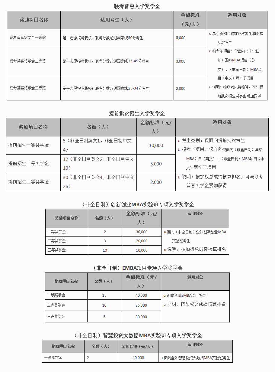 設(shè)立五種類別入學(xué)獎(jiǎng)學(xué)金,以資鼓勵(lì)報(bào)考我校MBA/EMBA項(xiàng)目、全國聯(lián)考初試分?jǐn)?shù)成績優(yōu)秀、提前批次招生面試表現(xiàn)出色的考生。