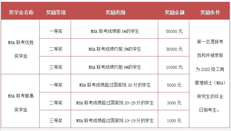 為了鼓勵優(yōu)秀人才攻讀非全日制工商管理碩士(MBA),培養(yǎng)更多品學(xué)兼優(yōu)的商界精英,北京交通大學(xué)MBA教育中心特設(shè)立MBA聯(lián)考優(yōu)勝獎學(xué)金、MBA聯(lián)考普惠獎學(xué)金。其獎勵范圍、獎金額度和獎勵對象如表二所示。2022級非全日制MBA新生獎學(xué)金評選辦法詳見后續(xù)通知。若有變動,均以具體通知為準(zhǔn)。