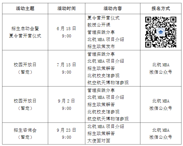 三、夏令營(yíng)安排為了讓全國(guó)優(yōu)秀考生近距離了解北航經(jīng)濟(jì)管理學(xué)院及MBA項(xiàng)目,深度體驗(yàn)北航MBA教學(xué)特色,選拔優(yōu)秀學(xué)生繼續(xù)深造,學(xué)院暫定于2023年6月-10月舉辦北航MBA夏令營(yíng)。歡迎有意向在北京航空航天大學(xué)經(jīng)濟(jì)管理學(xué)院MBA項(xiàng)目學(xué)習(xí)的優(yōu)秀管理者踴躍報(bào)名。夏令營(yíng)共包括兩個(gè)環(huán)節(jié),招生宣傳活動(dòng)及綜合考核,兩個(gè)環(huán)節(jié)可獨(dú)立參加。