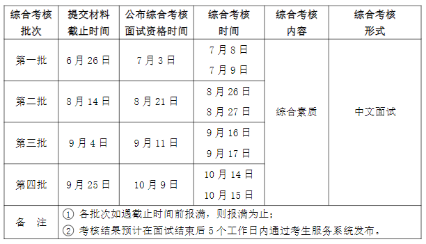 2、綜合考核安排綜合考核共分四個(gè)批次,考生僅可選擇其中一個(gè)批次進(jìn)行申請(qǐng)。